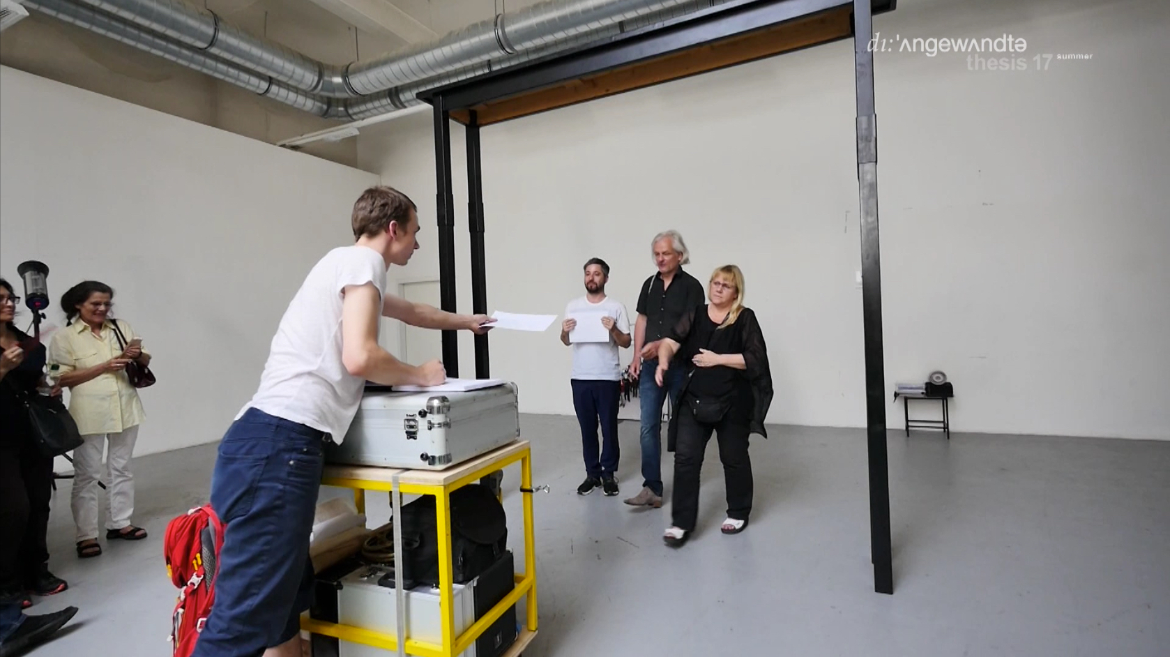 My original intention for the final presentation was a conversation with the commission, without the usual spectators. For me, that would have been the most direct act of information transfer and an opportunity for shared reflection. But things developed differently than planned. The dynamics of the situation that afternoon led to a classical presentation with around 30 spectators standing opposite me together with the commission. As a result, the presentation took on a performative character.