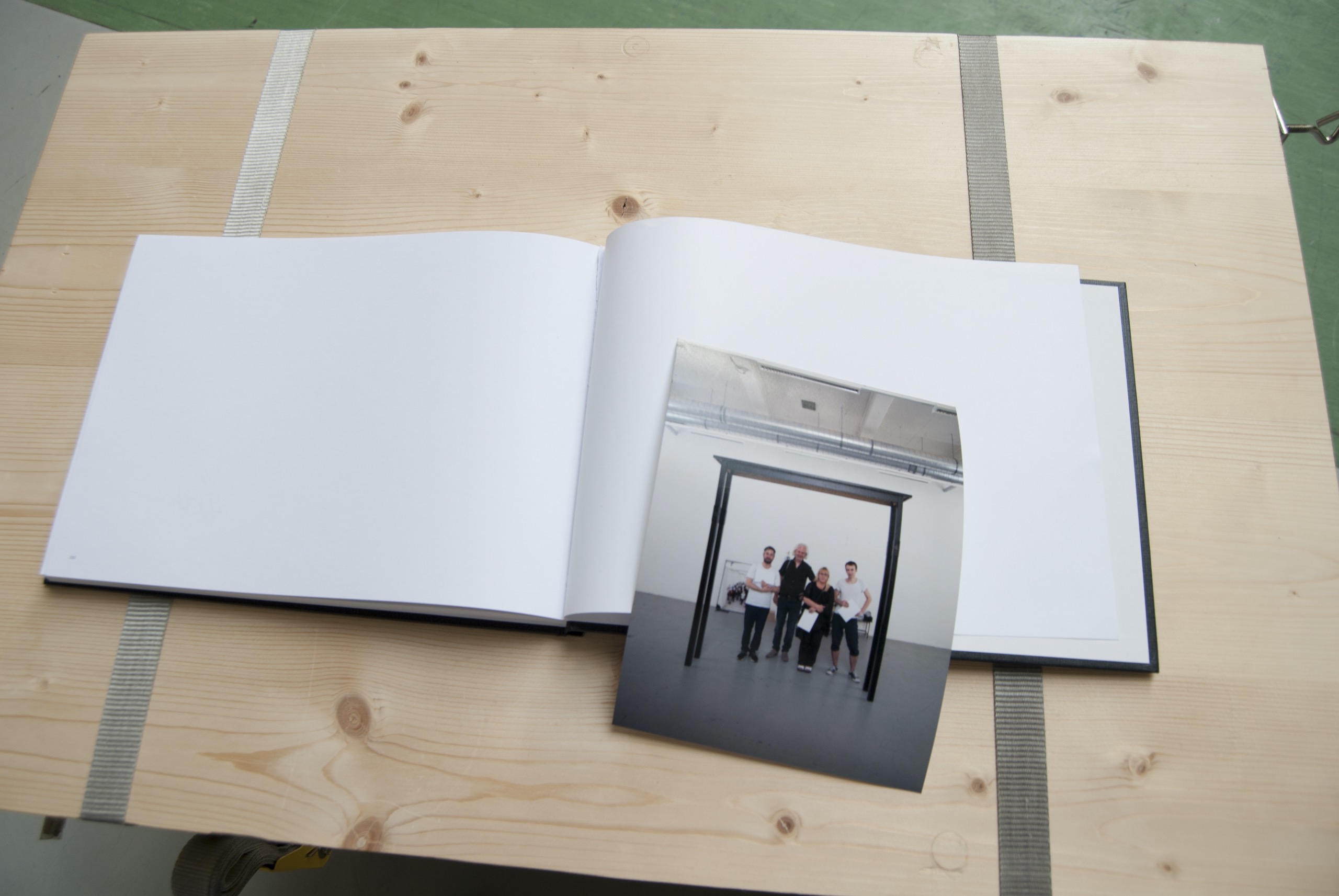 The photograph showing Peter Kozek, Nicolaj Kirisits, Ruth Schnell and Tomasz Vollmann holding the removed pages was inserted into the book in place of the torn-out pages.