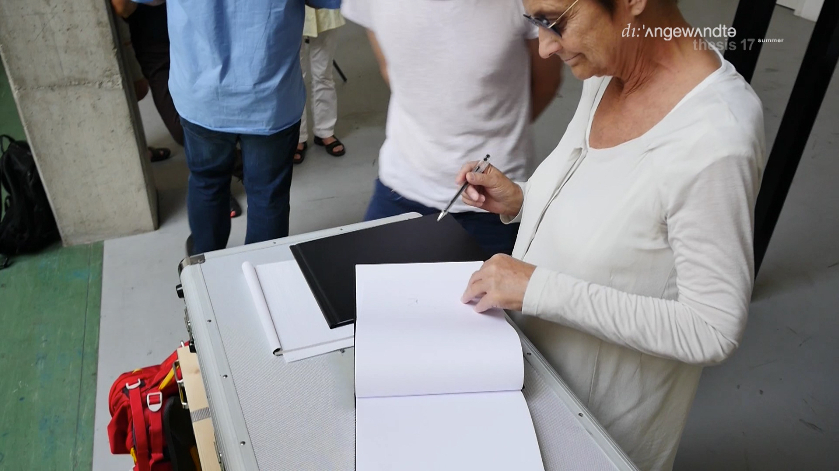 The situation ended with the following result: a photograph was produced in which three members of the commission and I — Peter Kozek, Nicolaj Kirisits, Ruth Schnell, and Tomasz Vollmann — hold the torn-out pages in our hands, while the other four left their signatures on the blank pages that remained in the book. These signatures were made by Ilse Lafer (p. 213), Martin Kusch (p. 215), Alexander Martinz (p. 217), and Brigitte Kowanz (p. 219).